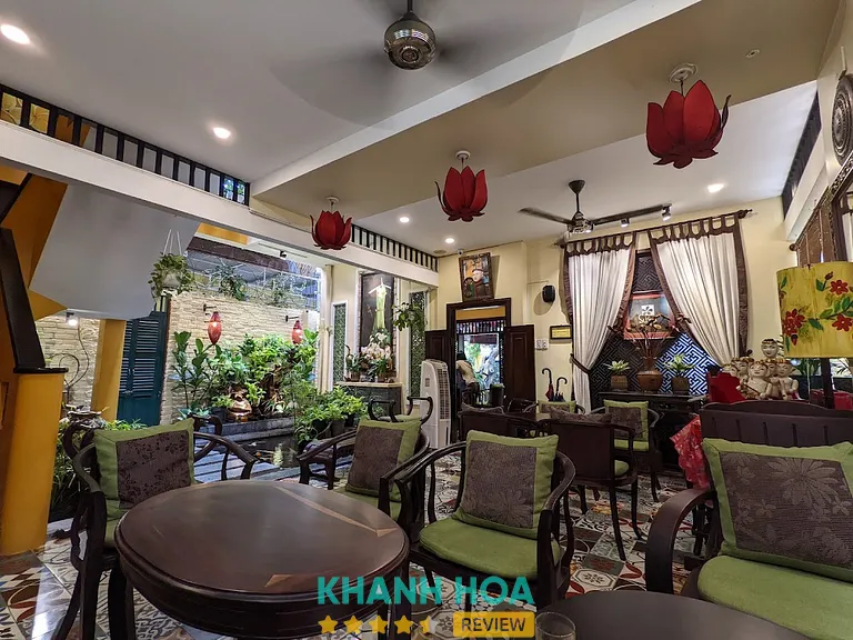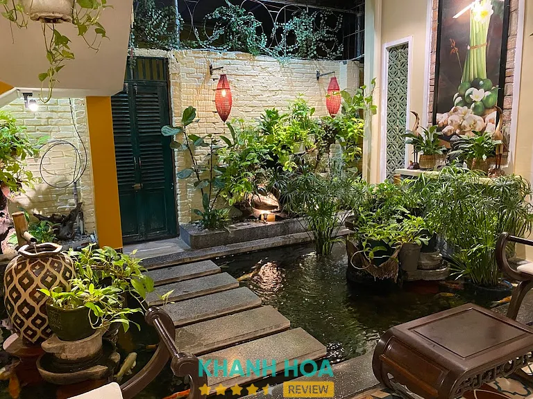 Ngay từ những bước chân đầu tiên qua ngưỡng cửa, bạn sẽ được chào đón bởi một khu vườn nhiệt đới xanh mướt mát. Qua những bức ảnh không gian, có thể thấy rõ một hồ cá Koi tuyệt đẹp nằm tĩnh lặng dưới những giàn dây leo, bên cạnh là những bức tường vàng rêu phong đặc trưng. Tiếng nước róc rách từ các đài phun nước nhỏ xen lẫn mùi hương dìu dịu của trầm hương và tinh dầu hoa sứ lập tức đánh thức mọi giác quan, rũ bỏ hoàn toàn sự ồn ào của phố thị ngoài kia.